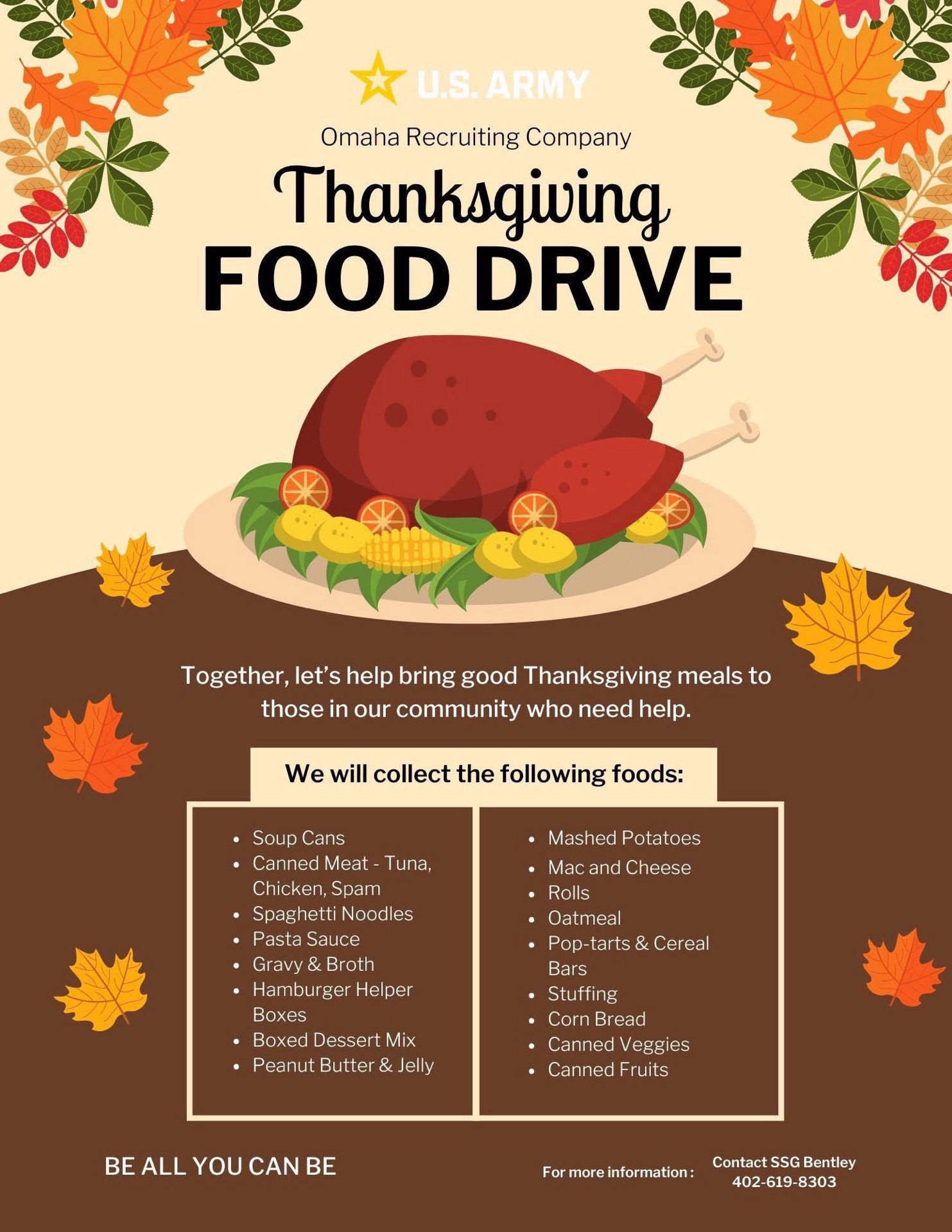 TEXT: U.S. ARMY Omaha Recruiting Company Thanksgiving FOOD DRIVE Together, let’s help bring good Thanksgiving meals to those in […] -