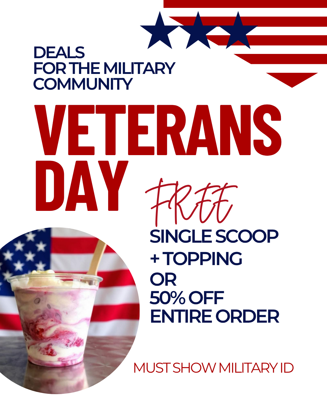 Veterans Day deals for our military community! Free single scoop + topping OR 50% off entire purchase! Must show military ID. Visit […] -