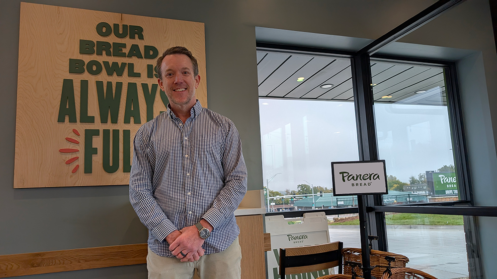 John Donahue stands inside the new Panera Bread location with signs, “Panera Bread” and “OUR BREAD BOWL IS ALWAYS FULL”